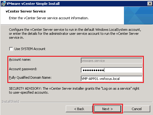 For Security reasons, I always specify an account for vCenter services to run under, you don’t have to do this, but if you want to tick the ‘best practices’ box it’s best too.
