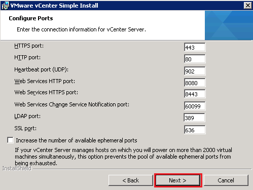 Ports, we can change the default ports used by all of vCenter’s services. I’m going to leave mine at default.
