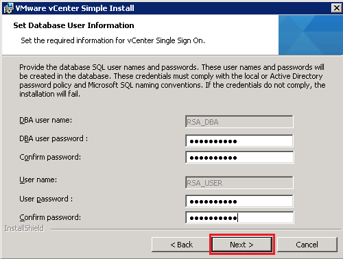 Cool, something new! The vCenter 5.1 installation is going to create two users RSA_DBA and RSA_USER in the SQL database, pop a password in that complies with your policies.