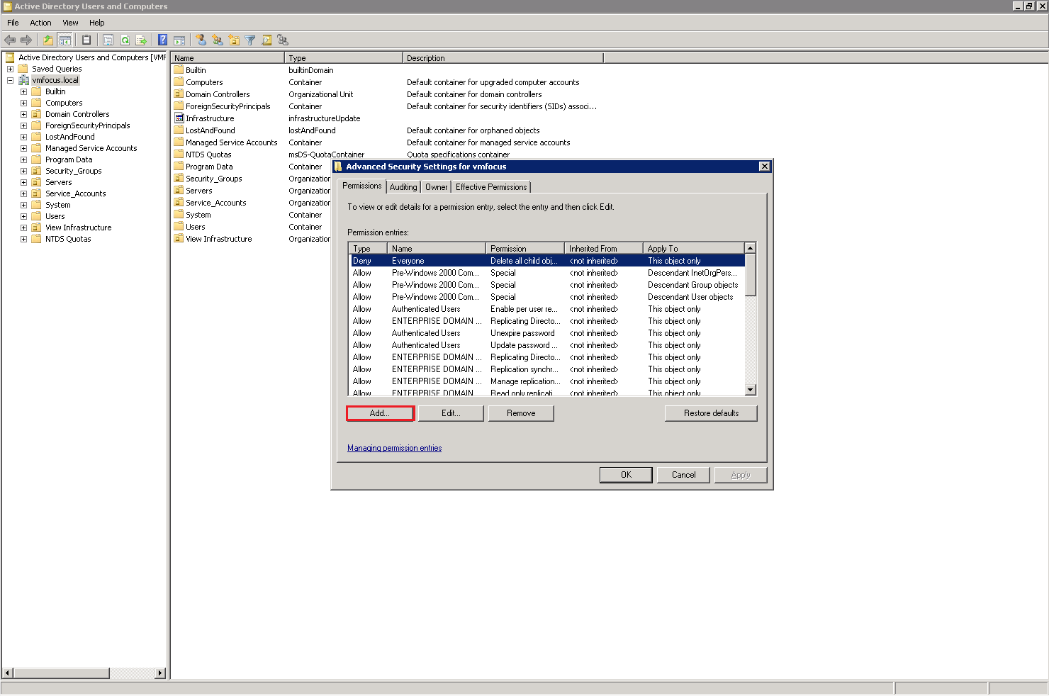 Next we need to give this Service Account rights to Create and Delete Computer Objects in Active Directory. Depending on how Organisational Unit structure you might do this on specific OU’s or on the whole domain. I’m going to do it on the whole domain as it’s easier for lab purposes.