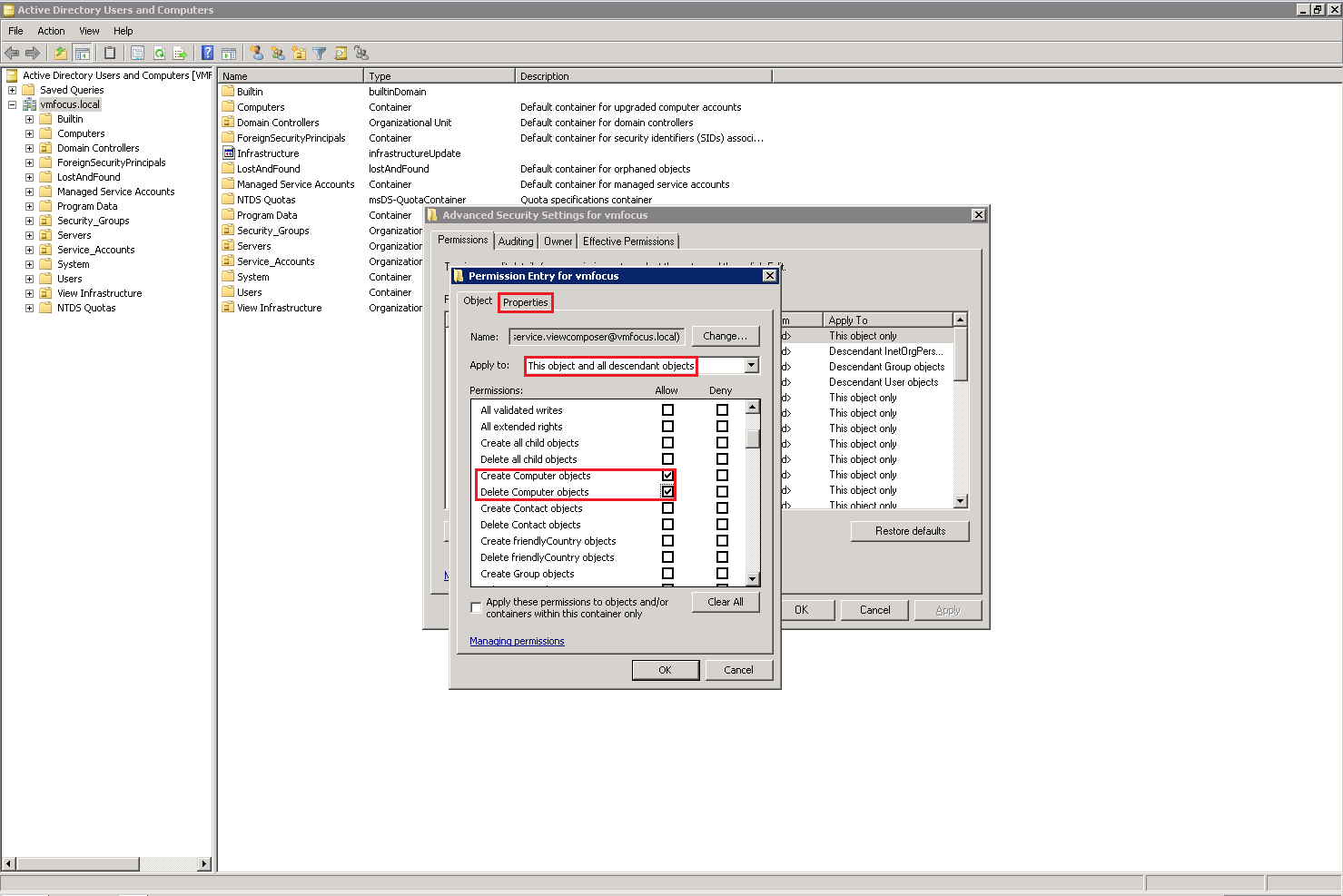 Ensure that ‘Apply to’ is ‘This object and all descendant objects ‘ and Permissions are ‘Create Computer Objects’ and ‘Delete Computer Objects’. Once you have done this Click On Properties