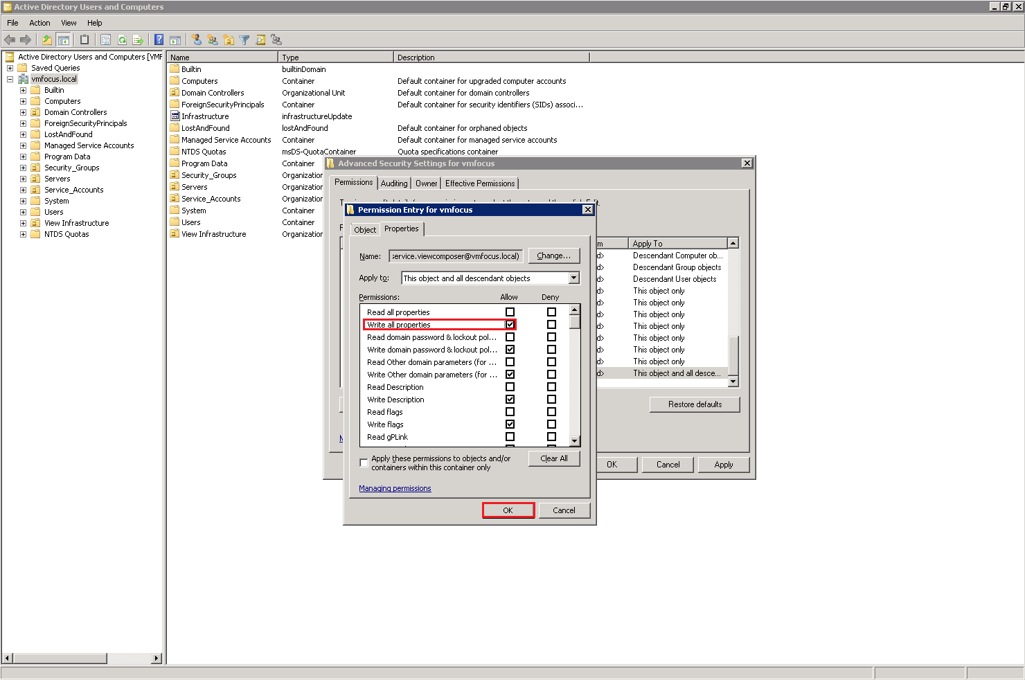 We are going to apply the permissions to ‘Write all properties’ Hit OK. You will notice that various other permissions are auto populated.