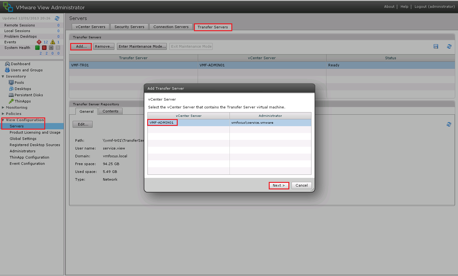 However, the process to enable the Transfer Server is fairly straight forward, go to View Configuration > Servers > Transfers and Select Add and choose your vCenter Server