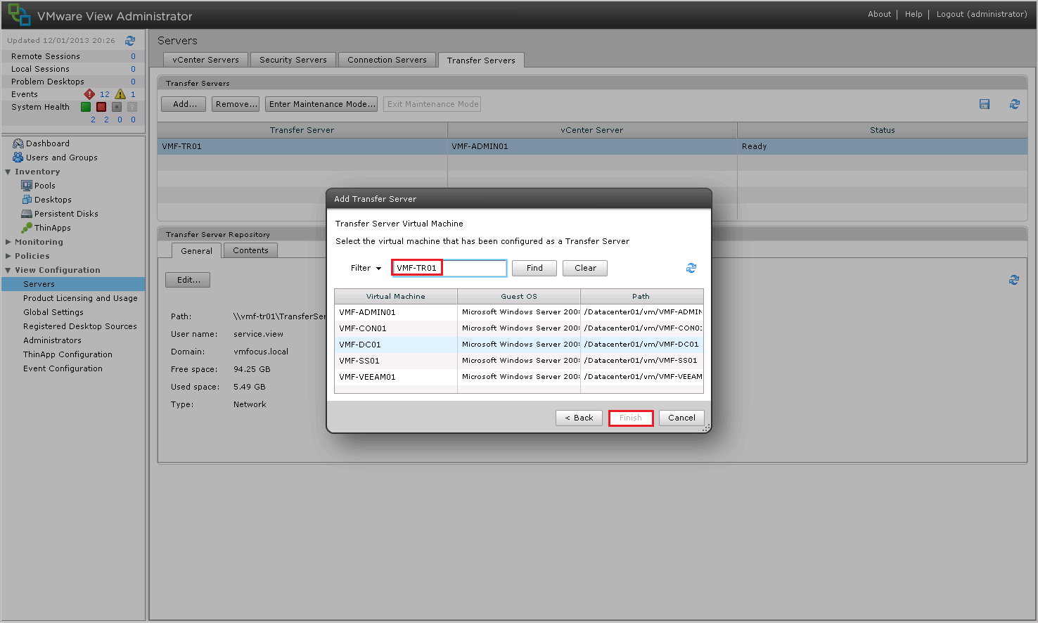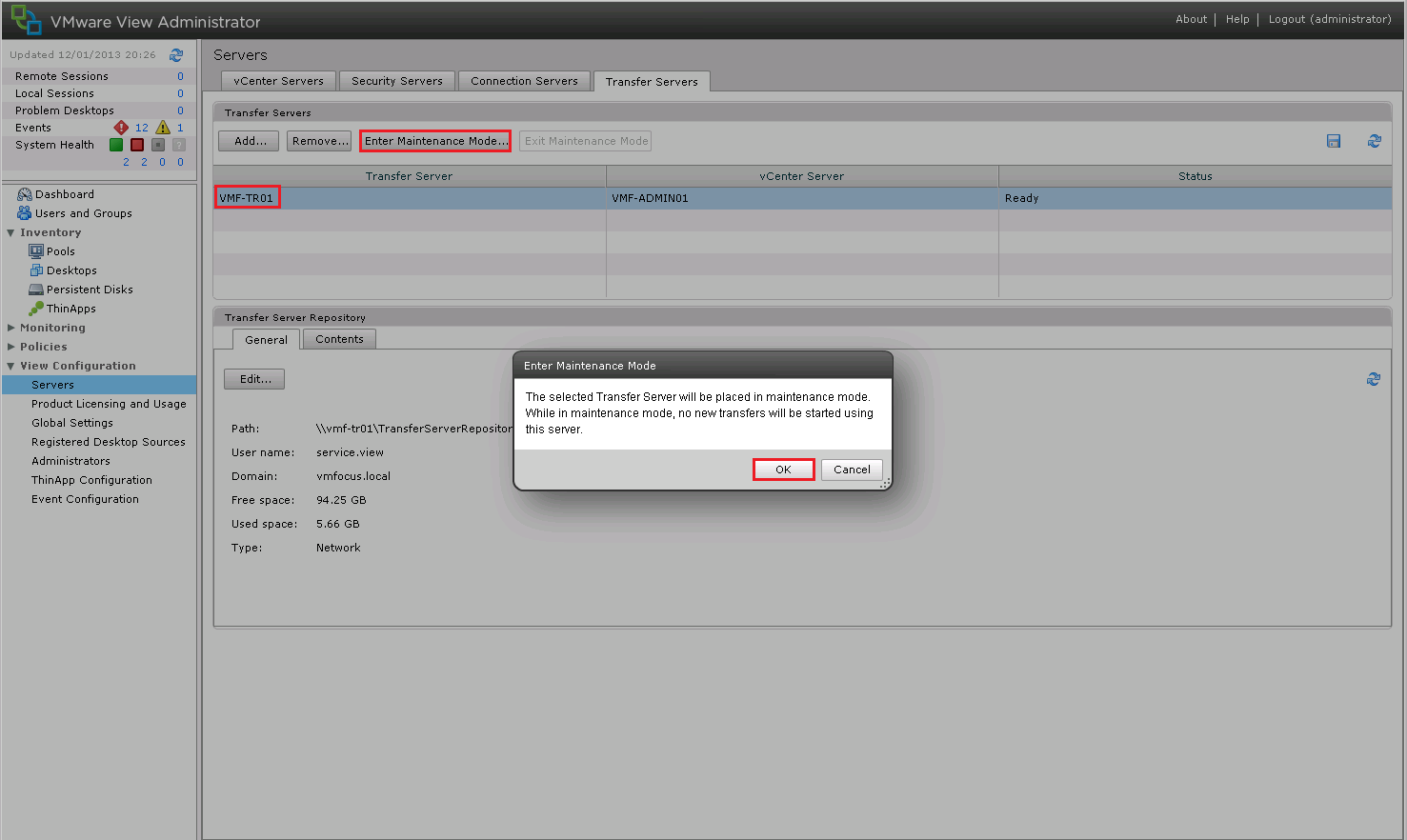 Back to View Administrator and we want to Edit the Transfer Server Repository and enter the following details: