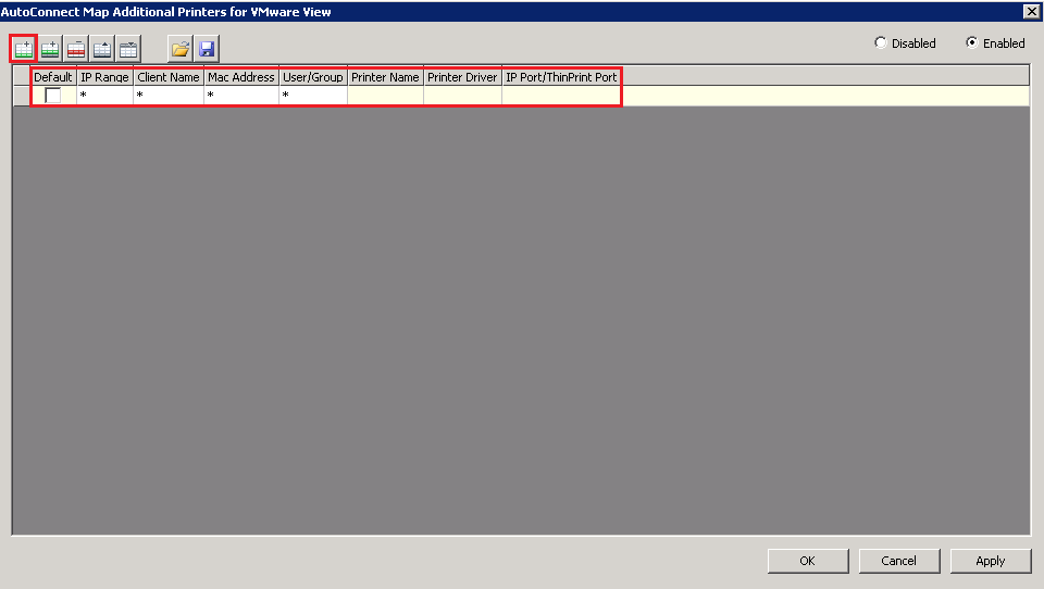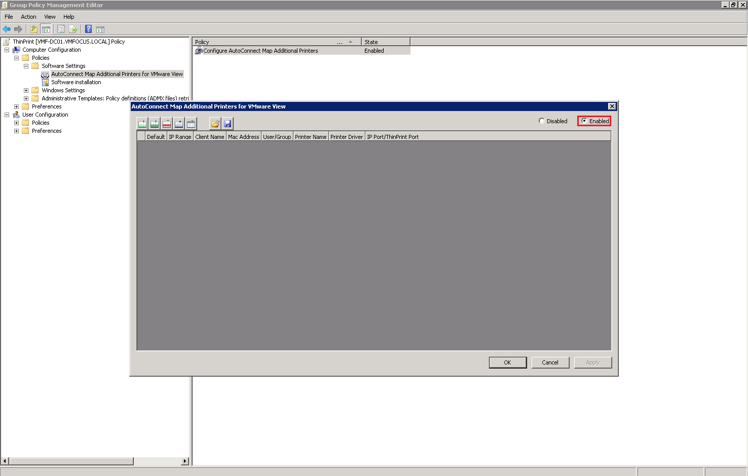Double Click AutoConnect Map Additional Printers for VMware View and set the Policy to Enabled by Clicking in the Top Right Hand Corner