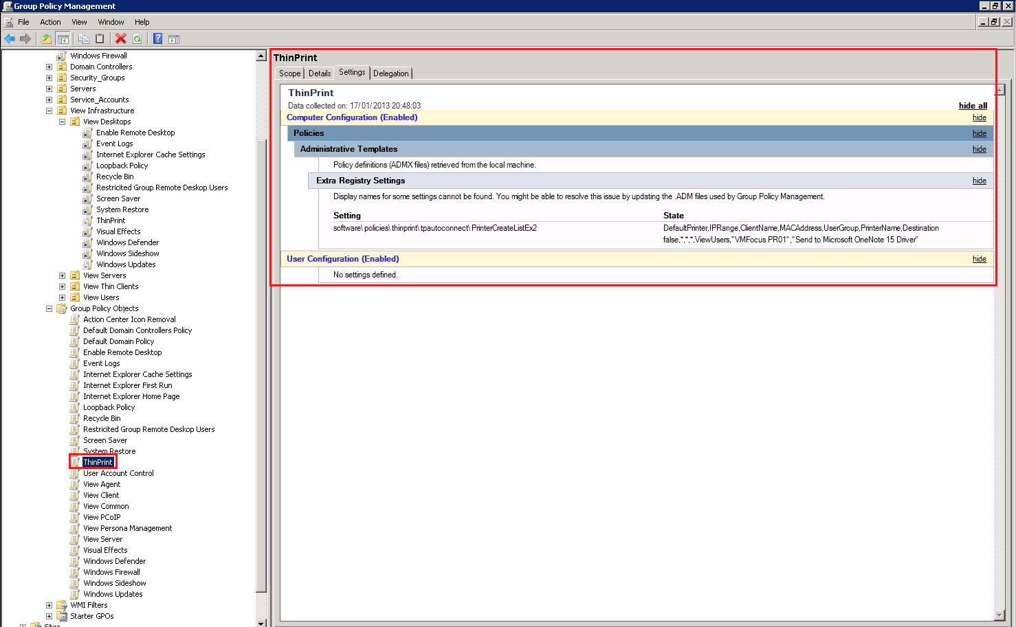 If we now check the ThinPrint Group Policy out you will see we have Extra Registry Settings Configured.