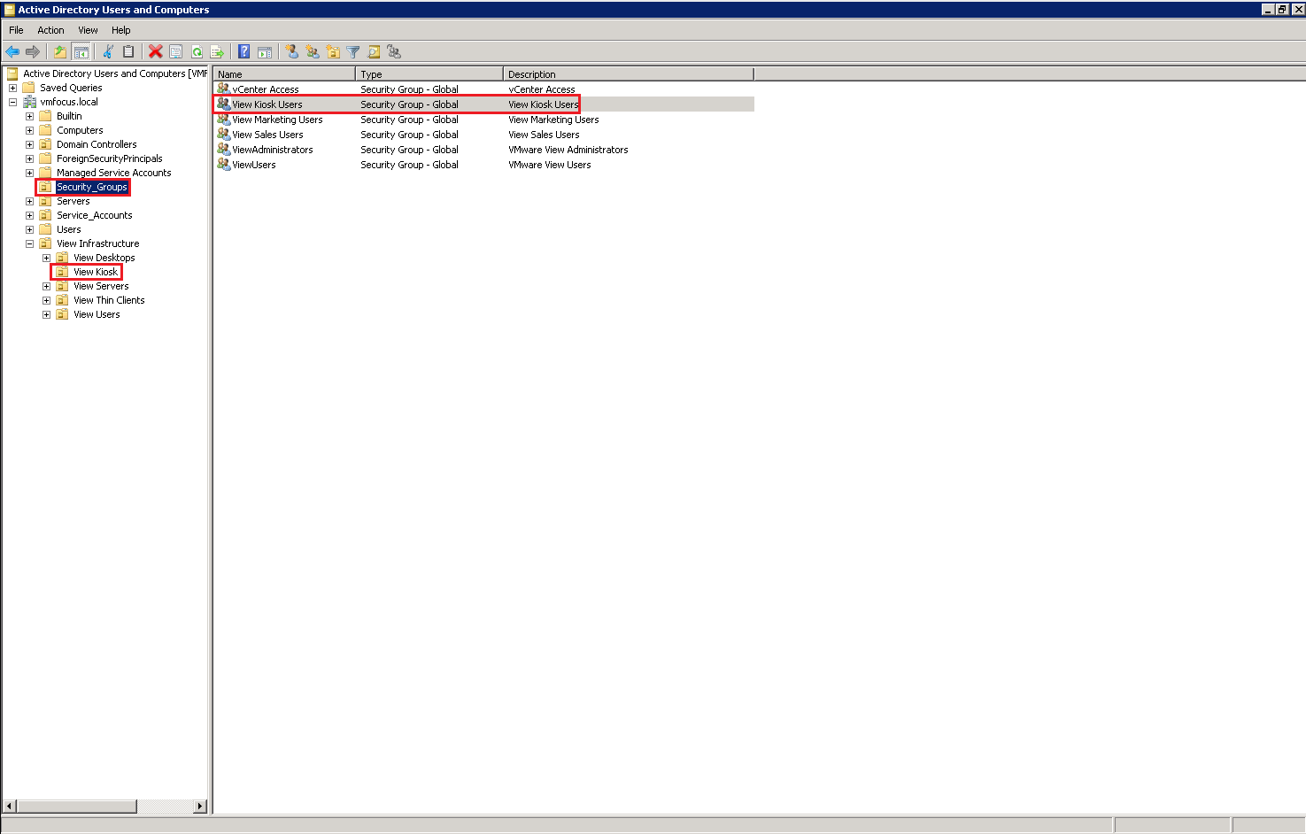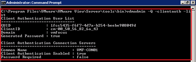 vdmadmin -Q -clientauth -setdefaults -ou “OU=View Kiosk,OU=View Infrastructure,DC=vmfocus,DC=local” -group “View Kiosk Users” -noexpirepassword