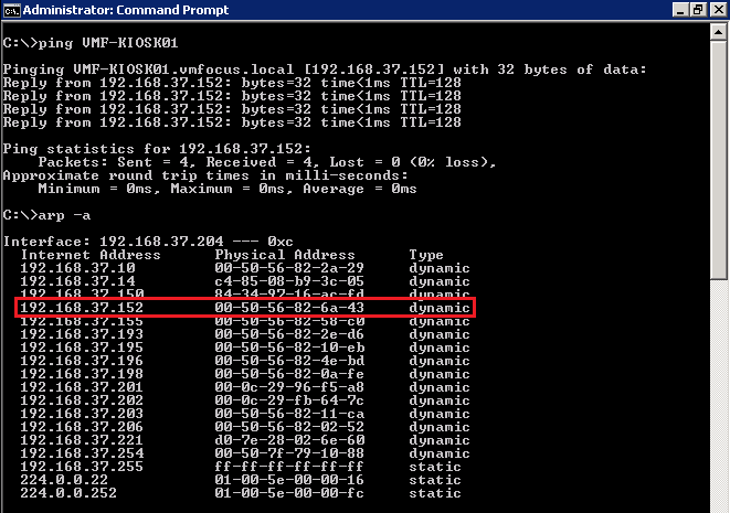 Now we need to get the MAC Address of the View Desktops, in my case VMF-KIOSK01. The easiest way to do this is too ping VMF-KIOSK01 and run arp -a from the command line