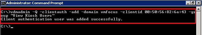 vdmadmin -Q -clientauth -add -domain vmfocus -clientid 00:50:56:82:6a:43 -group “View Kiosk Users”