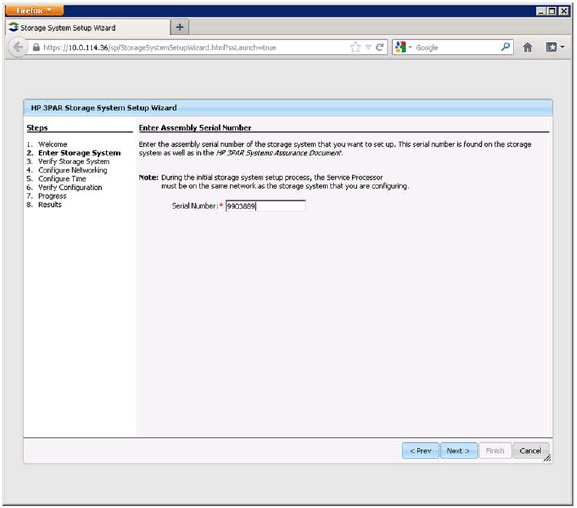 Click next a couple of times and then at this point you will need to enter the ‘assembly serial number’ which is on the StoreServ or your HP 3PAR System Assurance Document.  To be clear this is the serial number for the complete StoreServ not an individual component.