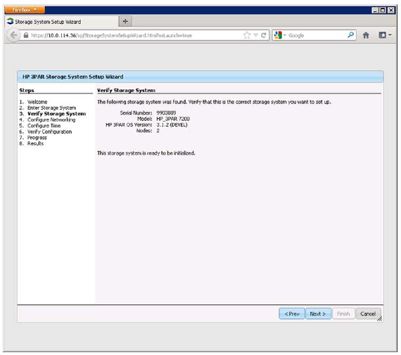 The StoreServ is then verified with the model, 3PAR OS version and the number of Nodes, hits next.