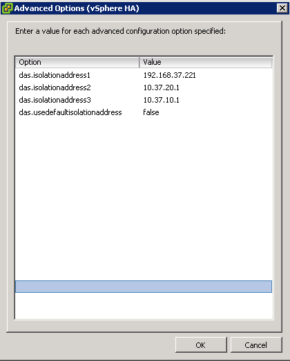 The default setting is a single isolation address which is your default gateway.  What happens if this goes down in a vSphere 4.1 environment? Well man down is the reaction!  Ensure that you specify numerous IP address, I commonly go for: