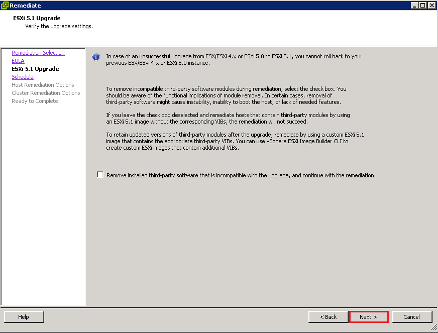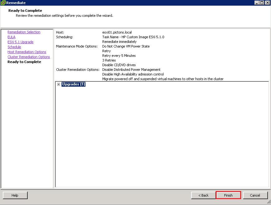 On the Host Remediation Options, make sure you tick ‘Disable any removable media devices connected to the virtual machines on the host’ as we don’t want an attached ISO to be the cause of our failure.  When you are ready hit Next