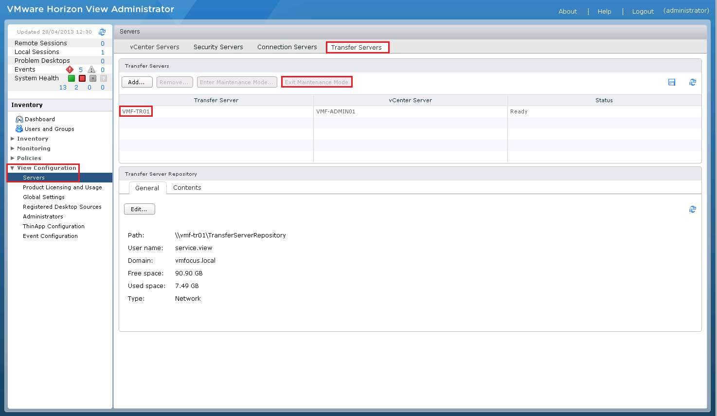 Now it’s back online let’s go into View Administrator and go to View Configuration > Servers > Transfer Servers > Exit Maintenance Mode