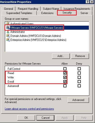 - Create an Active Directory Security Group for your vCenter Servers and add these to the Security Tab and give them Read, Write and Enroll Permissions