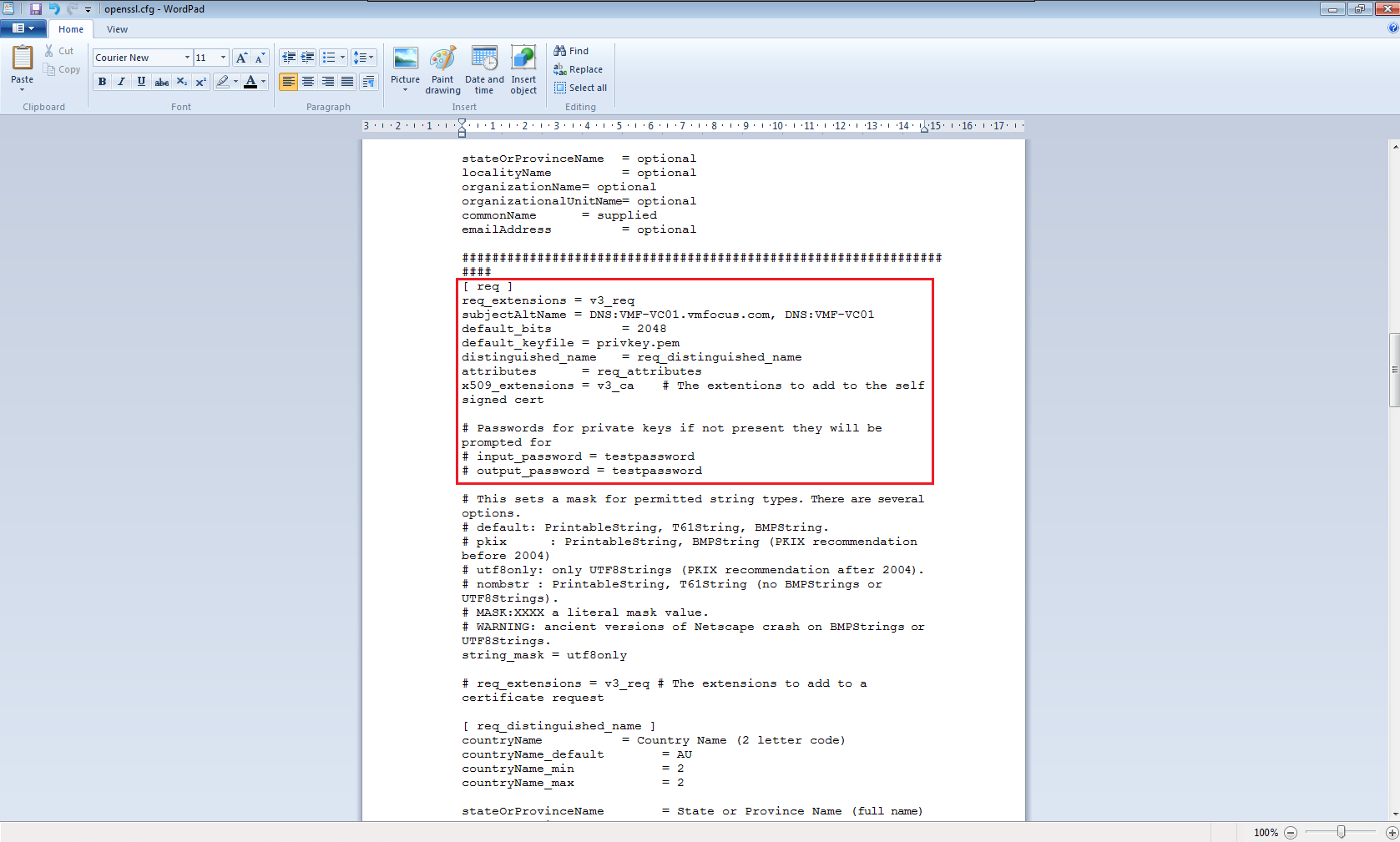 Now openssl.cfg using Wordpad and find [ req ] and insert these two lines directly underneath