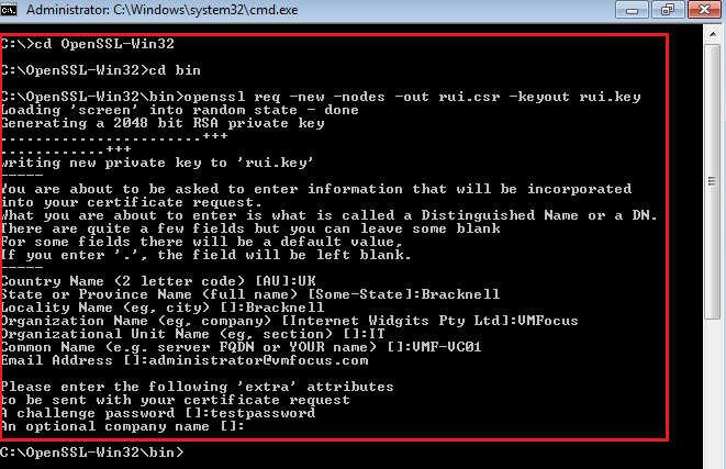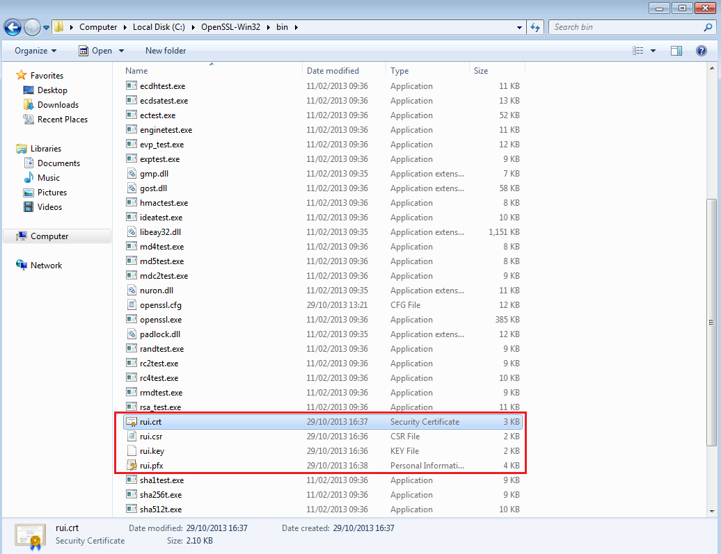 Rename the certificate to rui.crt and drop it into the C:OpenSSL-Win32bin folder. You should now have three files called: