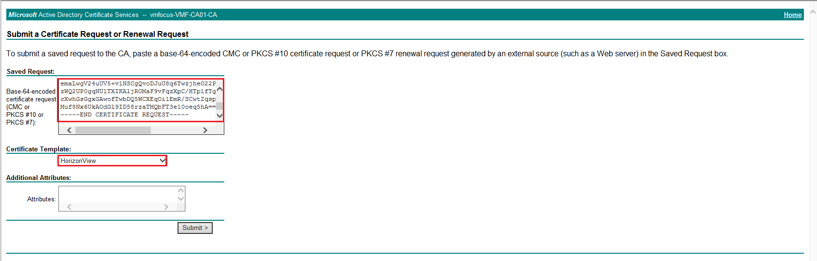 Fire up Internet Explorer and got to http://InternalCA/certsrv and Select > Request Certificate > Advanced Certificate Request > Submit a certificate request by using a base-64-encoded CMC or PKCS #10 file, or submit a renewal request by using a bae-64-encoded PKCS #file