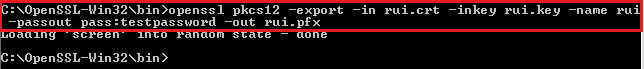 openssl pkcs12 -export -in rui.crt -inkey rui.key -name rui -passout pass:testpassword -out rui.pfx