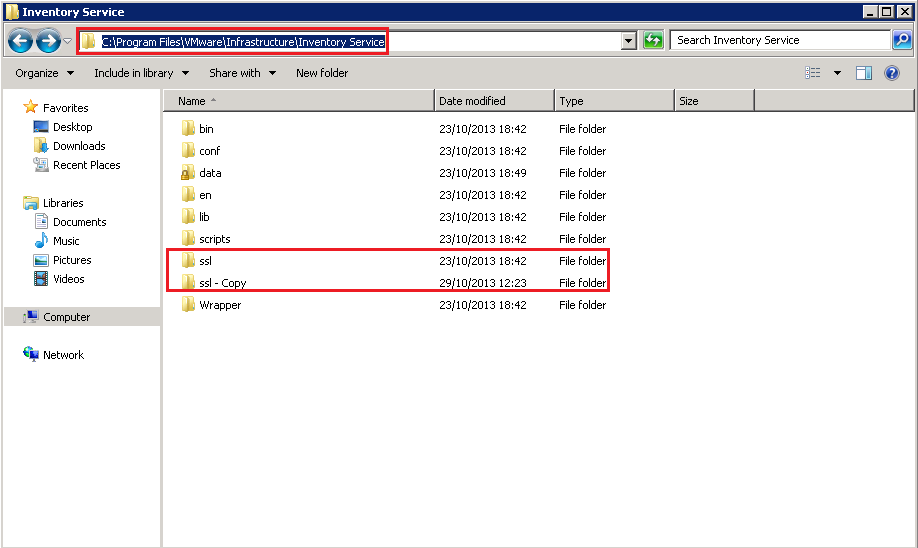 Navigate to C:Program FilesVMwareInfrastructureInventory Service and make a copy of the SSL folder