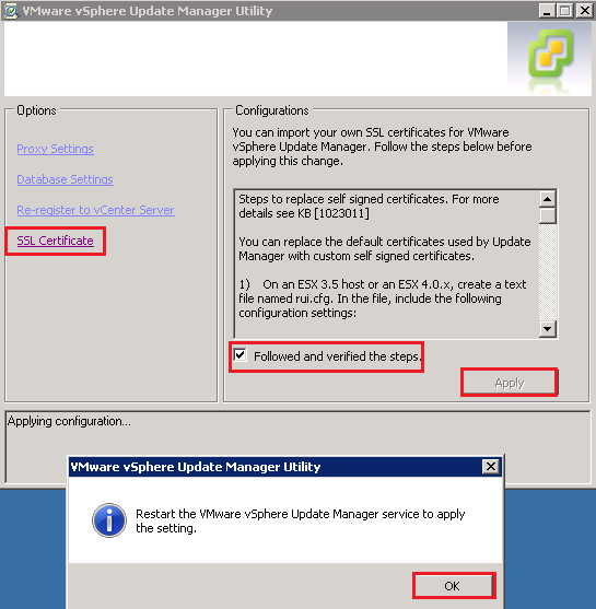 Enter your vCenter Server credentials then Select SSL Certificate > Tick ‘Followed and verified the steps’ > Apply