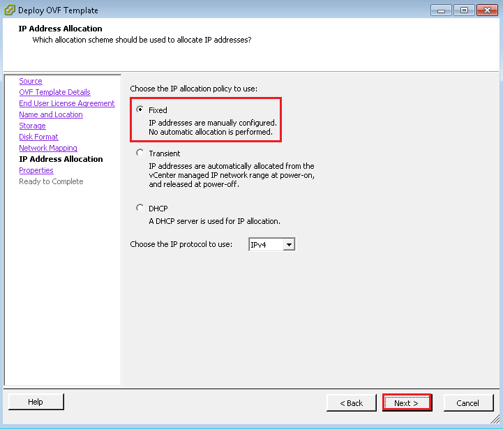 When you get to the IP Address Allocation Policy select ‘Fixed’