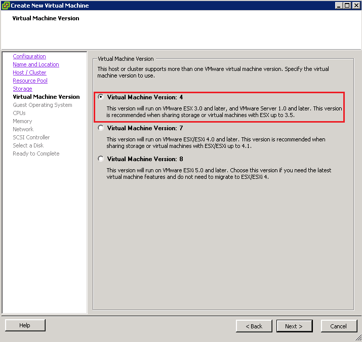I created a VM using ‘custom’ so I could choose Hardware version 4 and installed Windows Server 2008 R2 from an ISO.