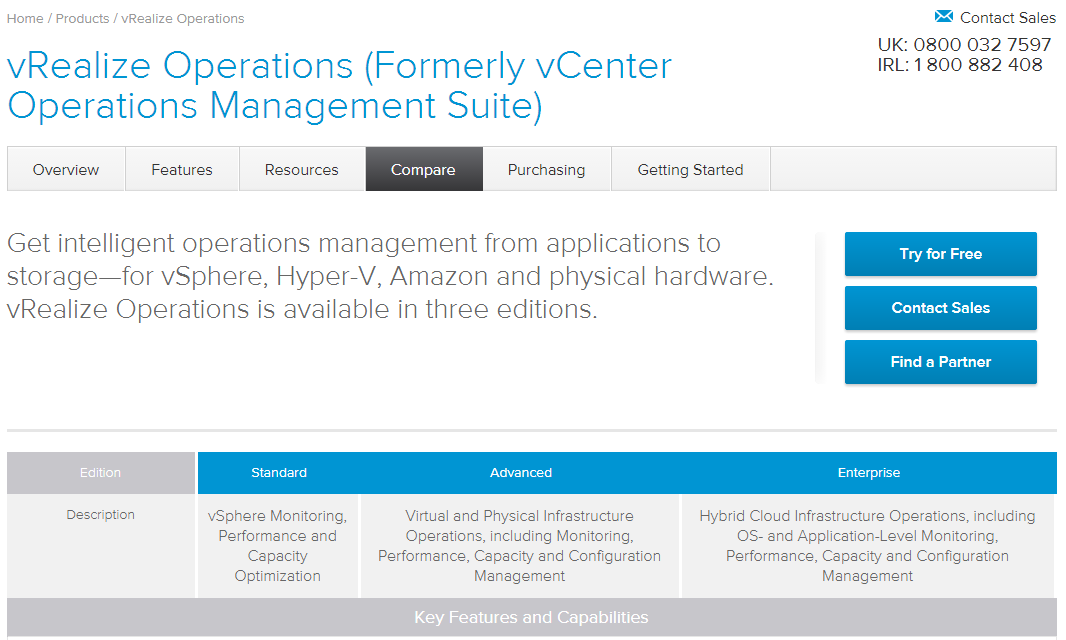 Screenshot taken from VMware United Kingdom vRealize Operations Manager edition comparison.
