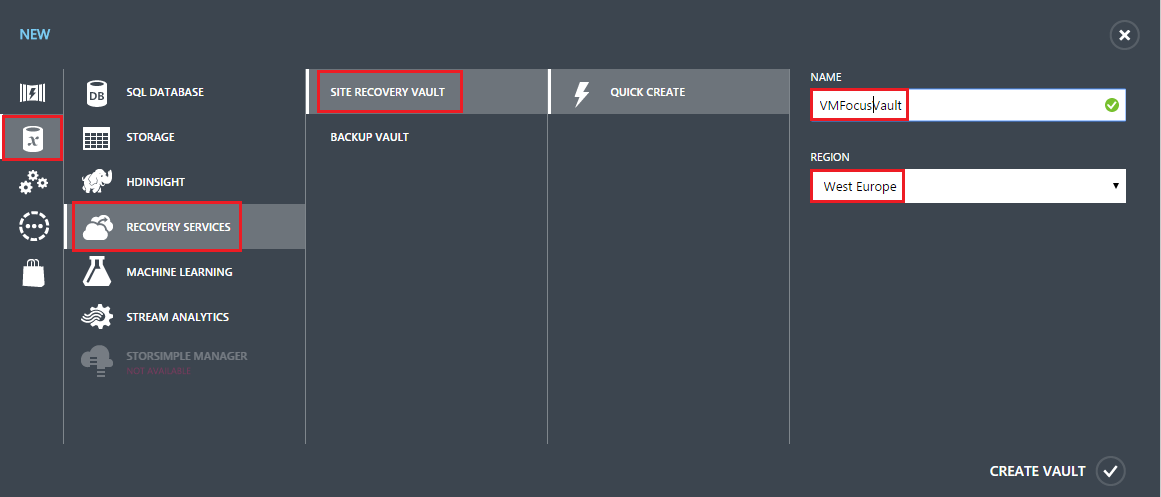 Next we need to create a vault for recovery services.   The process is straight forward.  Select Recovery Services > Site Recovery Vault > Quick Create > Enter Name & Region