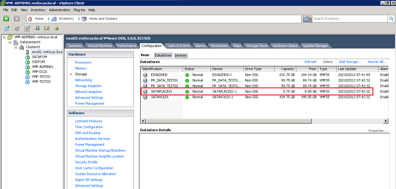 In my lab, I have created two volumes at the Production site called PR_SATA_TEST01 and PR_SATA_TEST02 these are thinly provisioned and contain the VMDK files for VMF-TEST01 AND VMF-TEST02 respectively.