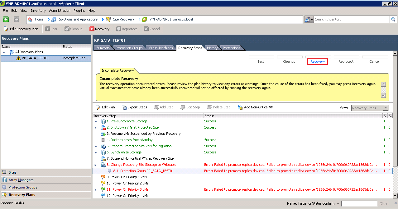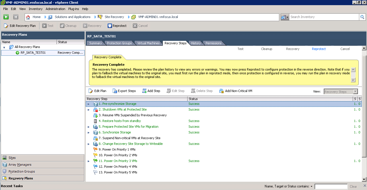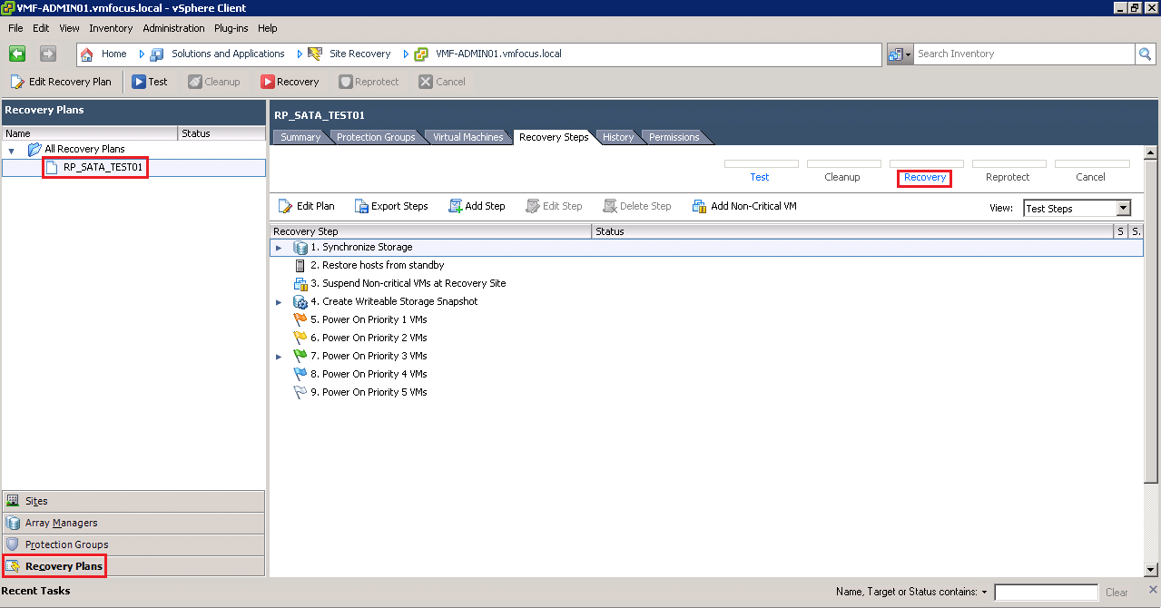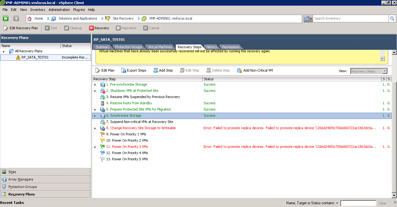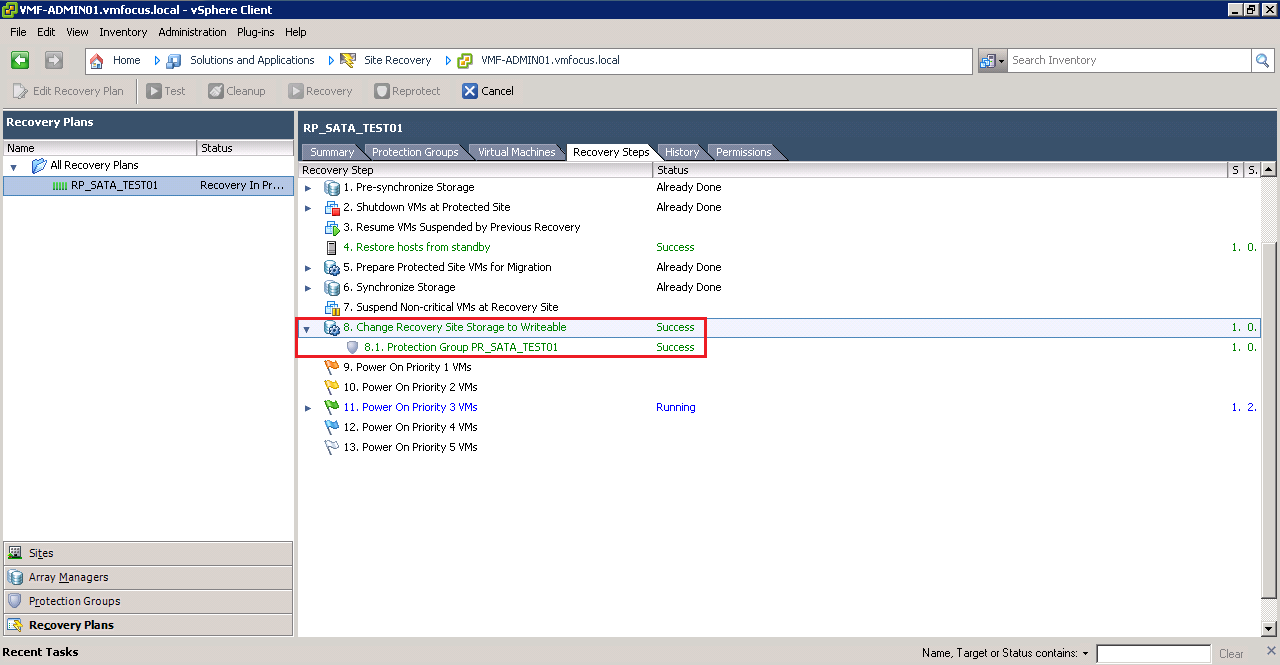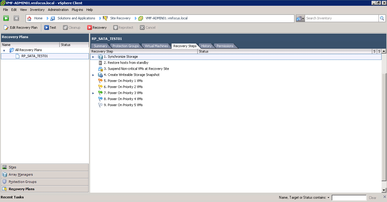 Let’s get it on, into SRM, then click on Recovery Plans, then onto Recovery Steps (so that we can see what’s going on) and then click on Recovery!