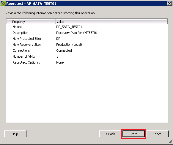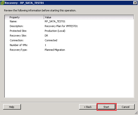 Select the ‘I understand that this process will permanently alter the virtual machines and infrastructure of both the protected and recovery datacenters.’ tick box again and click Next and Start.