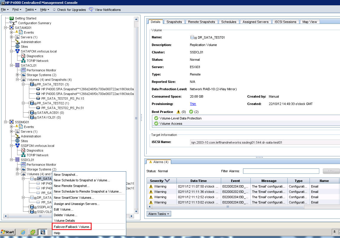 We are going to Right Click DR_SATA_TEST01 and Select Failover/Failback Volume