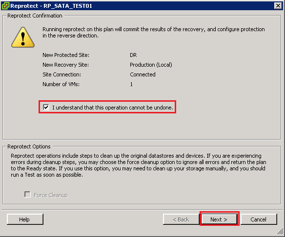 The Red Stop Sign cracks me up, it’s SRM’s way of saying are you really sure you want to do this? We are sure, so we want to put a tick in the ‘I understand that this process will permanently alter the virtual machines and infrastructure of both the protected and recovery datacenters.’