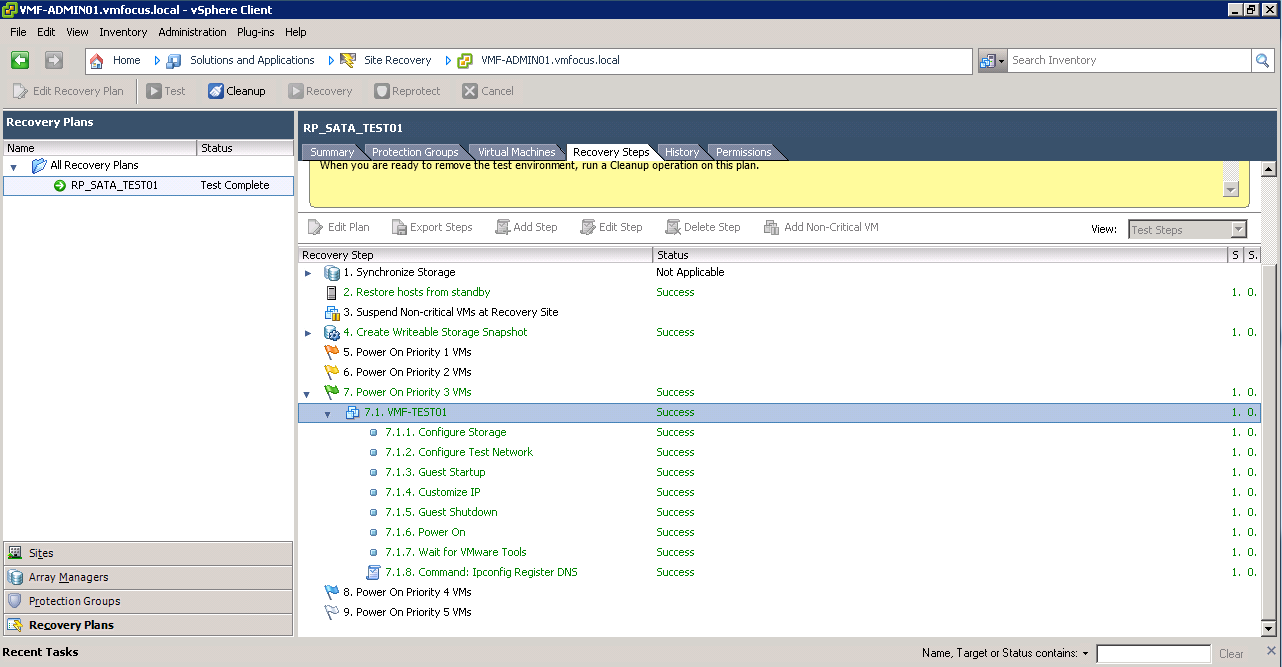 Hopefully you should see that SRM jumps straight to Step 8, Change Recovery Site Storage to Writeable and this time it has been a Success!