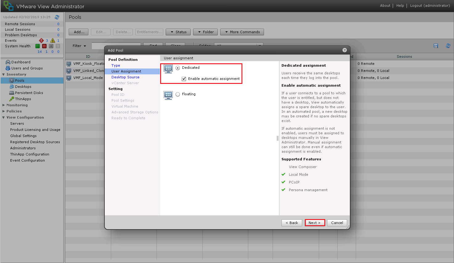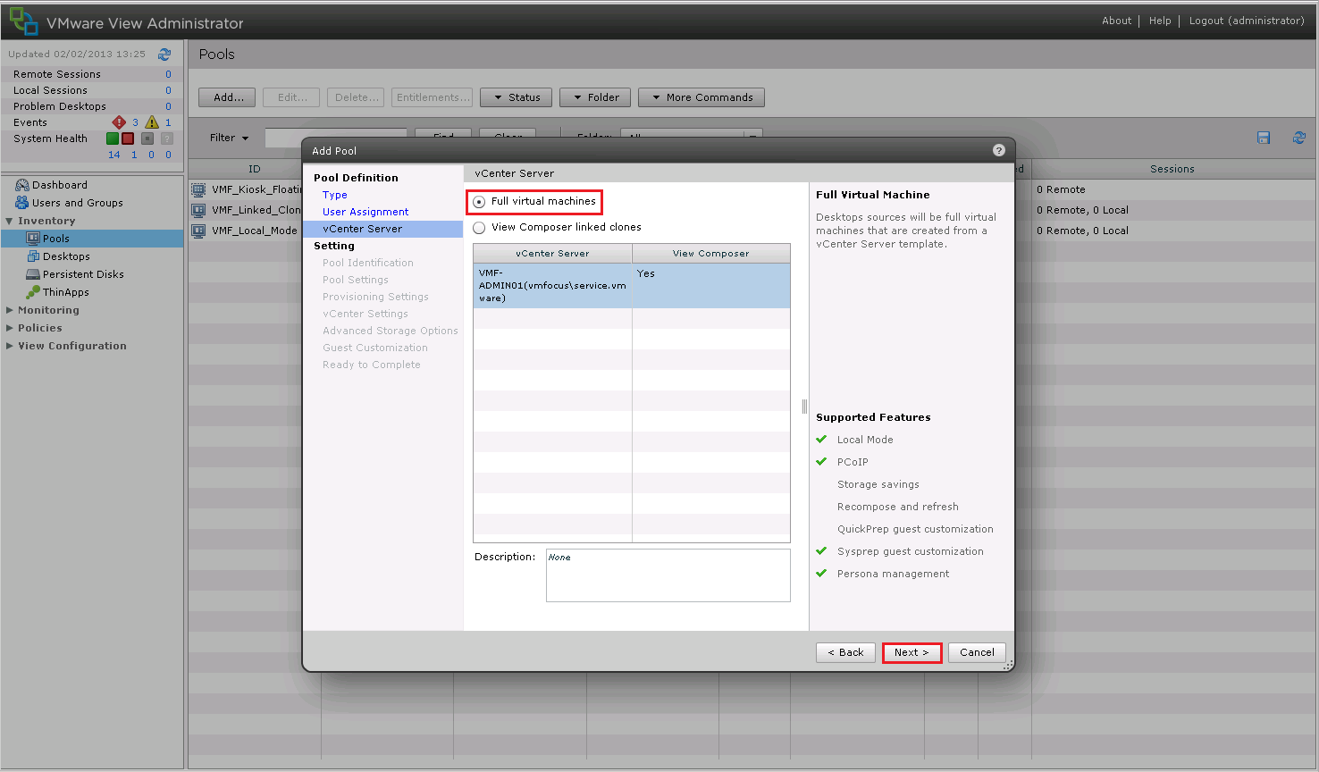 Back into View Administrator > Inventory > Pools > Add